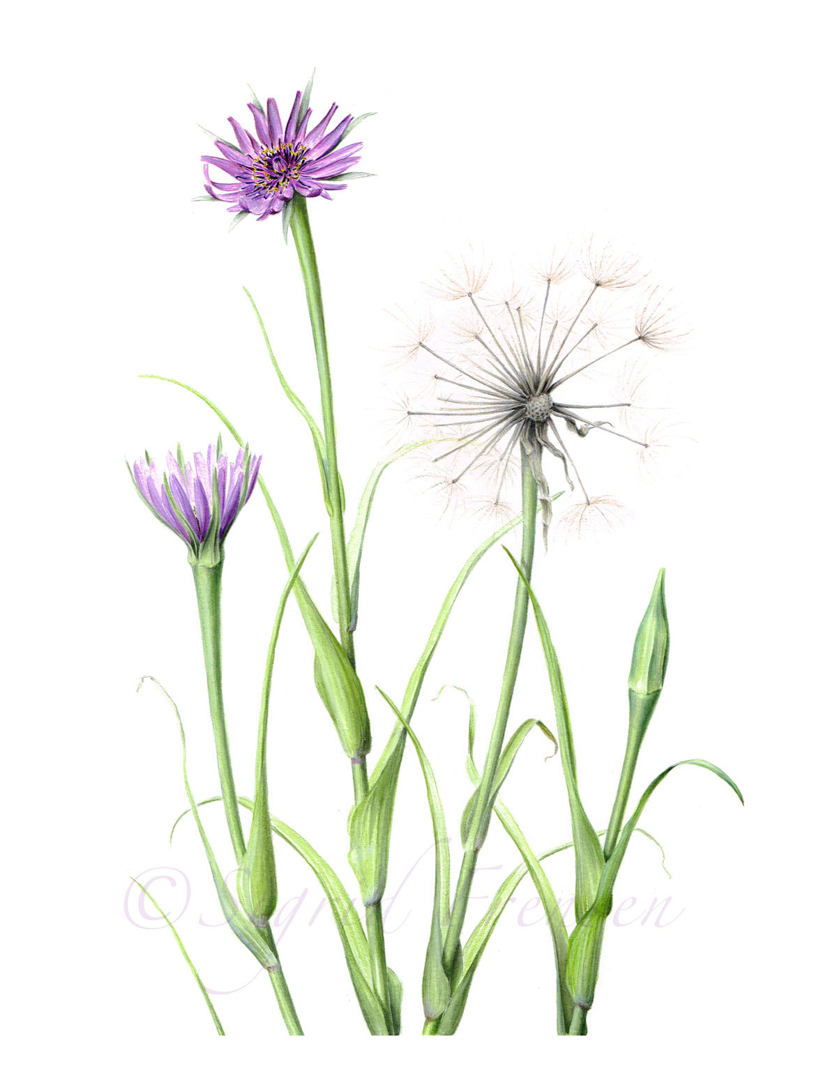 And what was next? Tragopogon porrifolius. What??? I know, it sounds like some sort of dinosaur. It actually is the Latin name of Purple Salsify. Another plant I chose for a reason. This plant grows only in a few parts in the Netherlands. One of the areas it grows is very close to where I live. In the western part of the province of Groningen. The plant has a few things that are worth showing. The nice coloured flowers of course and the huge seedheads. A real adventure to paint those.