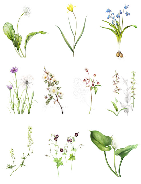 It's nice to see them all together like this. I was very fortunate to have already two of the list that I have painted some time ago. Maybe you remember the Allium ursinum (top row left), which I painted for the SBA exhibition a few years ago. The other one is even older. It's Scilla siberica (top row right). It was done when I started with coloured pencil and I made it on cold pressed paper.