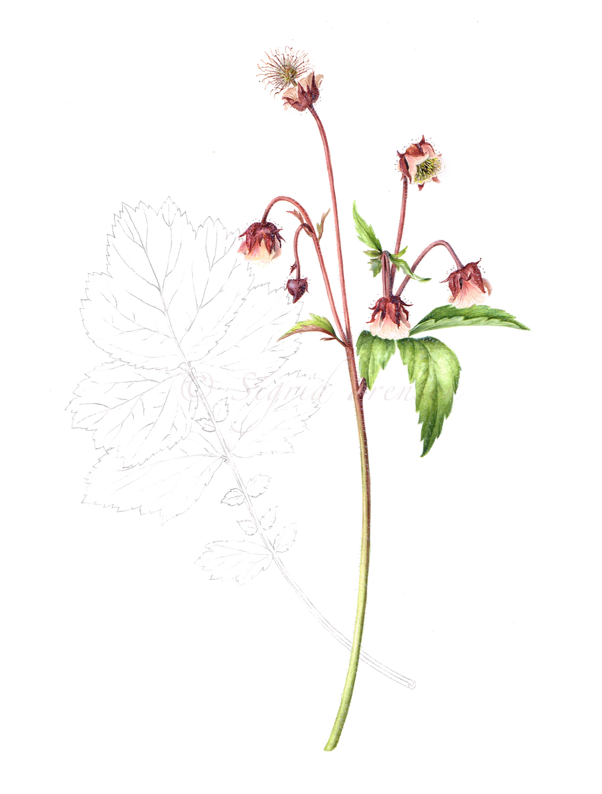 For each of the plants I had to think what I wanted to show and what would be the best way to do it. One of the things I constantly had to keep in mind was that I had a limited amount of time. When I started on the Geum rivale I had to make concessions. Normally I would have painted more flower stems. That's how they grow together, like a round clump of leaves and flowering stems. But the flowers are a bit complicated, the seeds are even more difficult. So I decided to do just one stem with several stages of flowering and a line drawing of a leaf in the back. It worked. Although in this scan you can't see the effect very well.